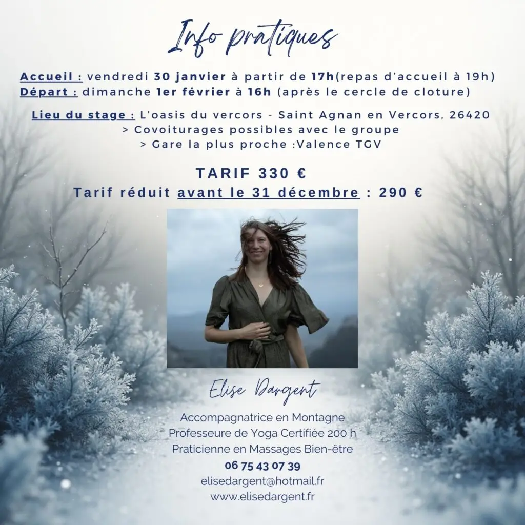 ❄ séances de yoga : réveil musculaire, mouvements et Yoga (Hatha et Vinyasa doux) le matin, yin yoga et récupération physique en soirée